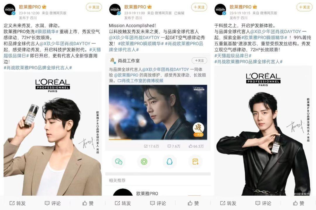 数据表现方面:品牌微博话题“欧莱雅PRO瞬顺精华”阅读量超过1亿,互动量超过165万,9月20日肖战参与当天品牌直播的造型话题“肖战长发全黑造型”阅读量超过1.2亿,互动量超过116万。