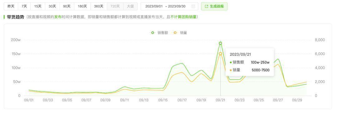 数据表现侧:特步在抖音站内的主要传播话题“唤醒新D球”获得了4.4亿次播放。飞瓜数据显示,9月21日特步带货销售额达到100万至250万,为9月最高。