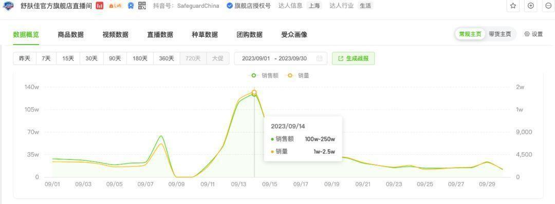 数据表现侧:品牌在抖音站内的传播话题“舒肤佳又出香水了”已经获得1802万次播放。飞瓜数据显示,舒肤佳官方旗舰店直播间在超品日活动结束后,9月14日当天的销售额达到了100万至250万,为当月销售额最高。