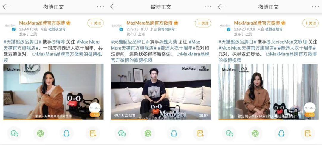 营销方面:MaxMara主要利用梅婷、文咏珊、李娜等文体明星进行营销,为超品日造势。9月4日起,MaxMara陆续发布由梅婷、马伊琍、魏大勋等出镜的宣传短片或平面大片,为泰迪大衣十周年及超品日宣传。不仅如此,从8月到9月,赵丽颖、迪丽热巴、赵露思、李娜陆续穿着“泰迪大衣十周年“纪念款系列大衣登上《时装男士》《上城士》《费加罗男士》《SoFigaro》杂志封面或内页。