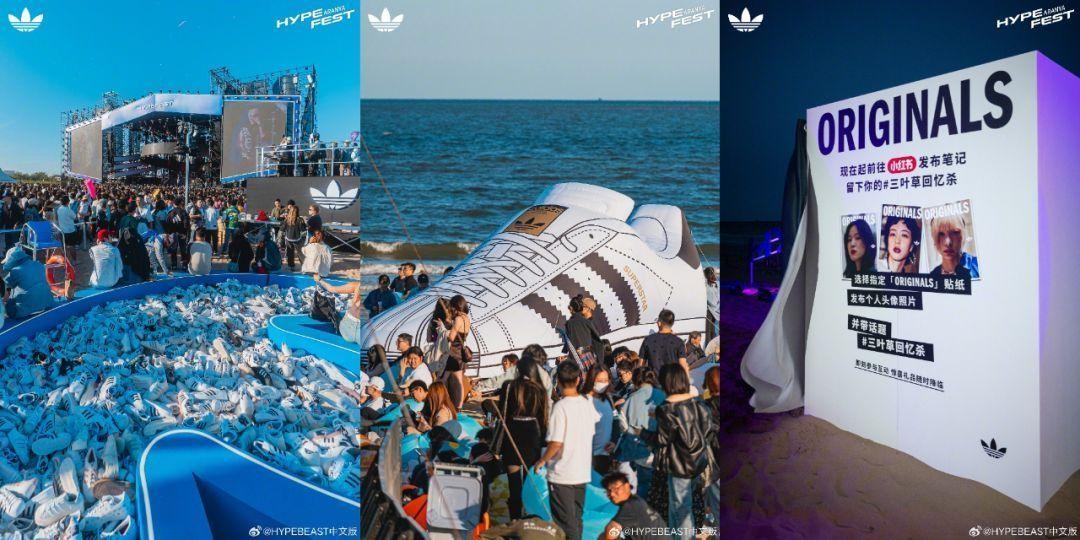 在线下,adidas Originals还在阿那亚联动了Hypefest Aranya音乐节,进一步扩大超品日影响力。据悉,adidas Originals在主舞台旁打造“千重回响俱乐部”,放置了8米高的巨型Superstar装置以及上千只 Superstar构成的“贝壳头海洋”,并在音乐节现场开启了荧光纹身贴、软饮特调等活动。此外,adidas Originals还在现场的接驳车站、音乐节围挡等不同角落呈现了不同圈层运动员、明星对于经典的理解,输出品牌理念。