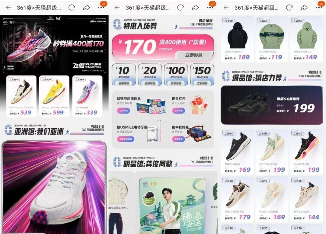 营销方面:361°本次主要利用品牌与亚运会的高度绑定进行赛事营销。作为亚运会四届官方合作伙伴,361°为火炬手、运动员、技术官员、安保人员等赛会工作人员定制了各类官方体育服饰装备。在亚运会开幕前期,361° 集团执行董事兼总裁丁伍号参与了接力杭州亚运会火炬传递,为品牌扩大声量。在超品日期间,品牌也通过大量与亚运会相关的内容进行营销。