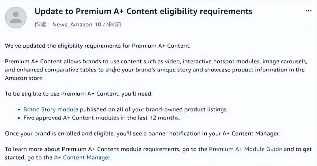根据亚马逊官方发布的信息,使用高级A+页面的资格评估每月进行一次。满足以上条件即自动生效,卖家无需单独联系亚马逊申请。如果卖家符合资格,将获得权限,届时将在A+ 页面管理器中看到一则平台方发送的通知: