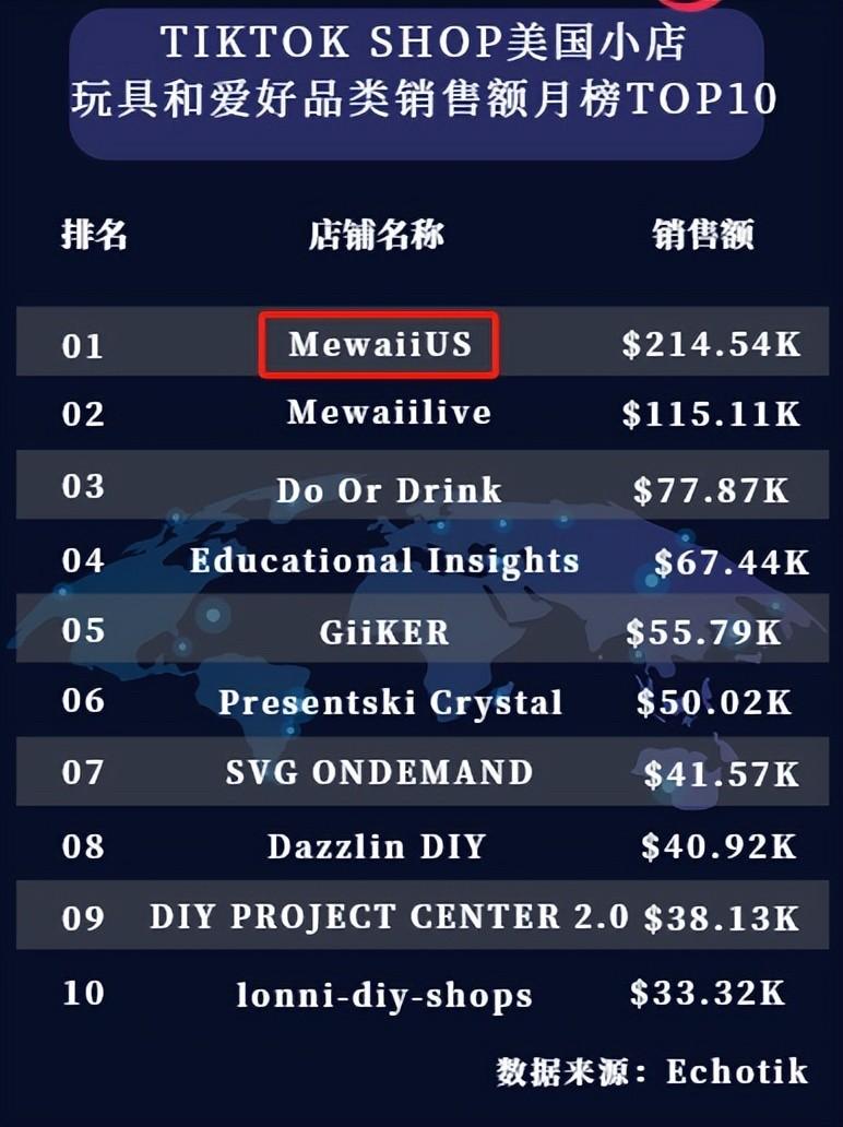根据Echotik(TikTok美国市场最专业的电商数据平台)最新数据显示,在上个月玩具和爱好这一品类销售额前十的榜单中,MewaiiUS登顶第一,在上个月的销售额达到了21.45万美金。MewaiiUS自在TikTok开通美国小店以来总销量66.3K,总销售额为60万美元,并且当前依然有着上涨的趋势。仔细研究该店铺的运营之路,可以看到他们的成功并不是空穴来风。