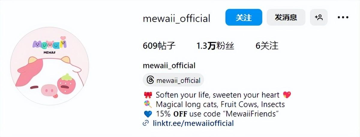 除了店铺的官方账号,mewaii为了使自己的品牌更加深入人心,在账号@mewaii town上发布以热销玩偶为主要角色的情景短剧,在TikTok上也收到了热烈的反响和回馈,获得了10.8万的粉丝。