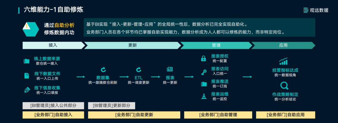 一是自助修炼。通过自助分析修炼数据内容。自助化后,数据分析成为人人都可以修炼的能力,而非特定岗位。