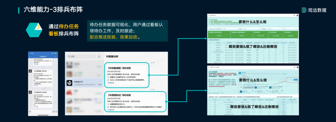 六维能力之三排兵布阵,通过代办任务看板排兵布阵。代办任务数据可视化,用户通过看板认领代办工作,及时跟进,配合推送技能,效果加倍。