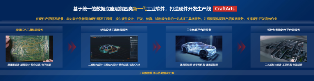 在此平台上,华为的工业软件朋友圈又再往前走了一步。在这次工业软件生态大会上,华为宣布,与数十家工具软件生态伙伴、供应商合作,把伙伴企业研发的先进硬件开发工具“连点成线”,打造新一代工业软件工具链——硬件开发生产线CraftArts。