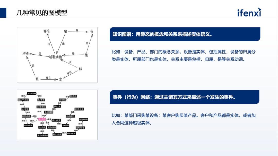 第二,事件(行为)型网络结构。这是一种使用主谓宾结构来描述发生的事件的方式,它可以表达我们的许多事务性操作。我们常见的许多表结构实际上是知识图谱结构和事件行为网络结构的结合体,这两种结构的结合使得我们可以将许多表结构进行相应的映射。