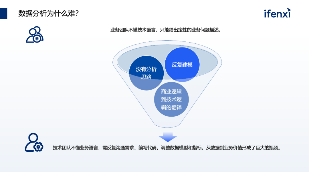 究其原因,主要是因为在国内的企业环境中,缺乏的是既熟知企业内部业务知识,又掌握数据结构且具备数据建模能力的人才,这实际上就是阻碍企业内部数据转变为应用或价值的一个颇为重要的瓶颈。在此基础上,我们的整个的业务团队,其能力实际上无法理解,或者只是了解一些技术术语,只能提供关于业务问题的基本描绘。