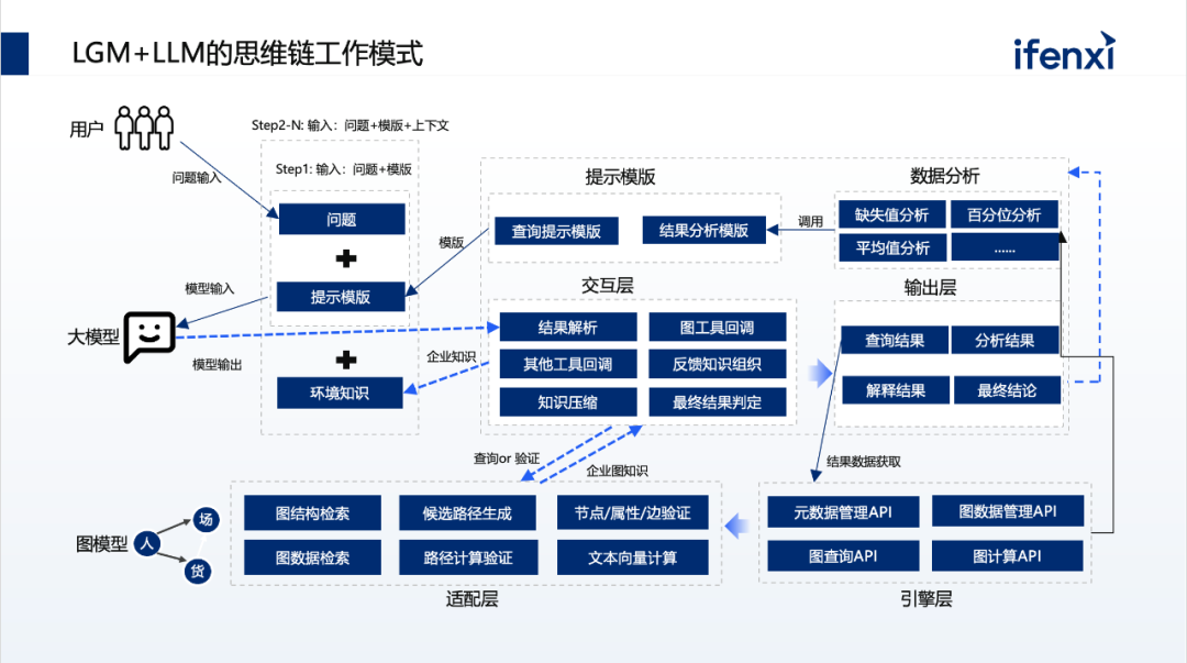 因此,我们采取了大语言模型与思维链处理模式相结合的解决方案,即在整个过程中采用多轮问答的形式,一步步地获取更精确的数据结果。首先,用户会提出问题,该问题将依据当前的提示模板交给大语言模型处理。在此过程中,大语言模型会将问题分解为多个子任务,分别调用相应的工具,这些工具将问题抽象成图表中的检索路径生成操作。而整个图模型还存储了企业内部的业务知识,能准确地反馈给大语言模型,然后进行下一步操作。
