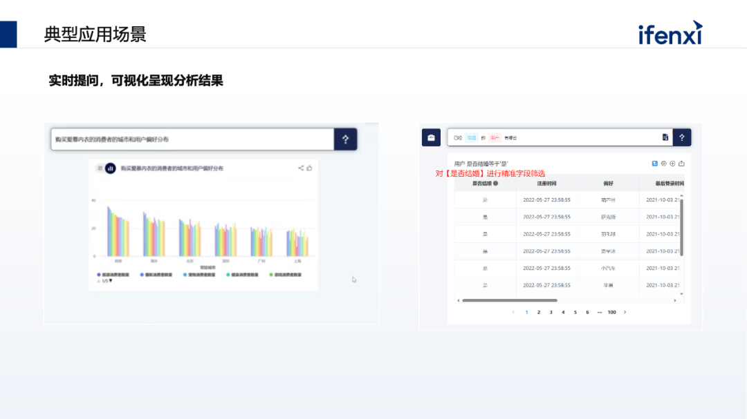 第一,实时提问,可视化呈现分析结果。在该应用场景下,整个形态是问答式,或者说是以搜索框为核心的界面,你可以提出想要了解的信息,例如将某一类用户画像与其购买商品的分布情况进行关联分析,系统即可实时生成针对该问题的可视化报告,同时也允许你用自然语言替代常见的数据库查询,来获取特定属性的用户列表,以快速实现信息的提取。