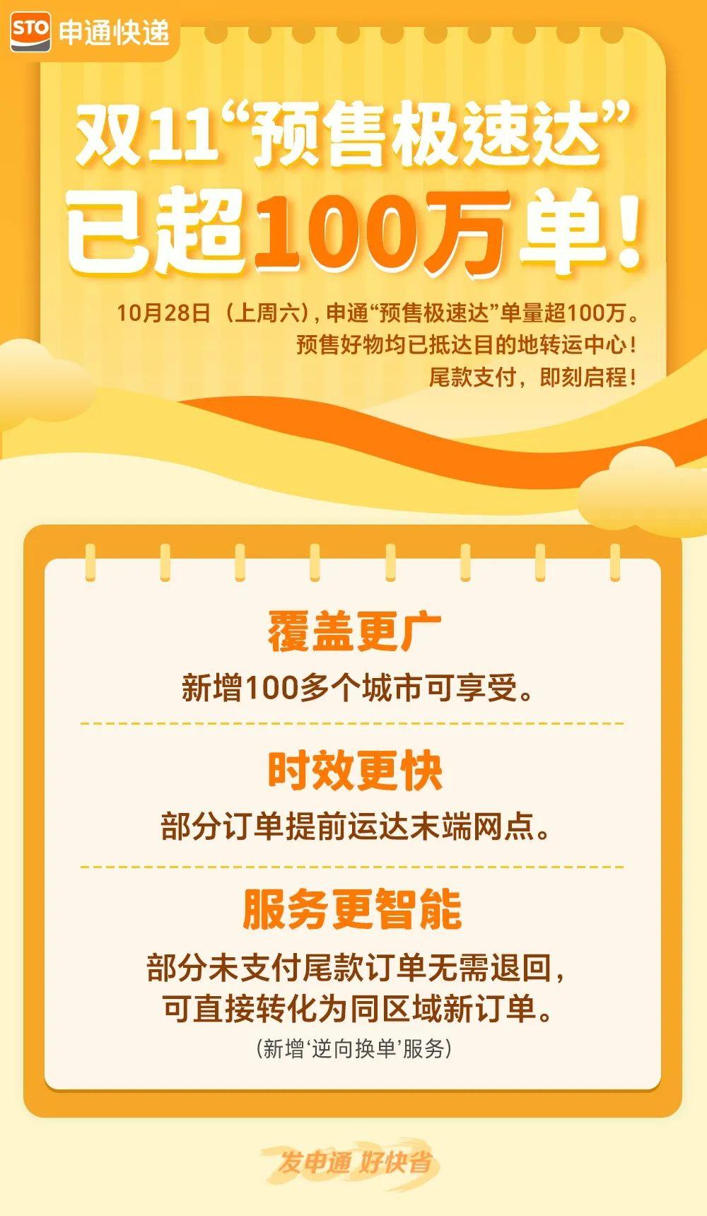 申通、德邦等快递也上线预售极速达模式,实现分钟级的快递配送速度。10月28日,申通“预售极速达”单量已超100万。