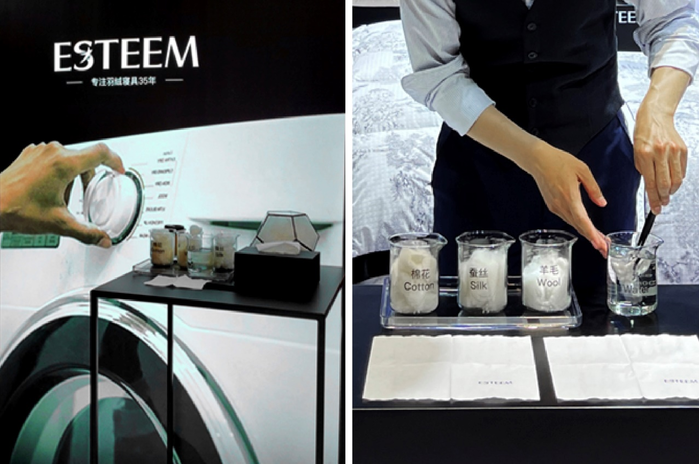 在进博会现场,宜庭呈现了可水洗鹅绒的拒水实验,可以看得见的绒朵拒水实力,抒写鹅绒智净干爽带来的舒适神奇体验。