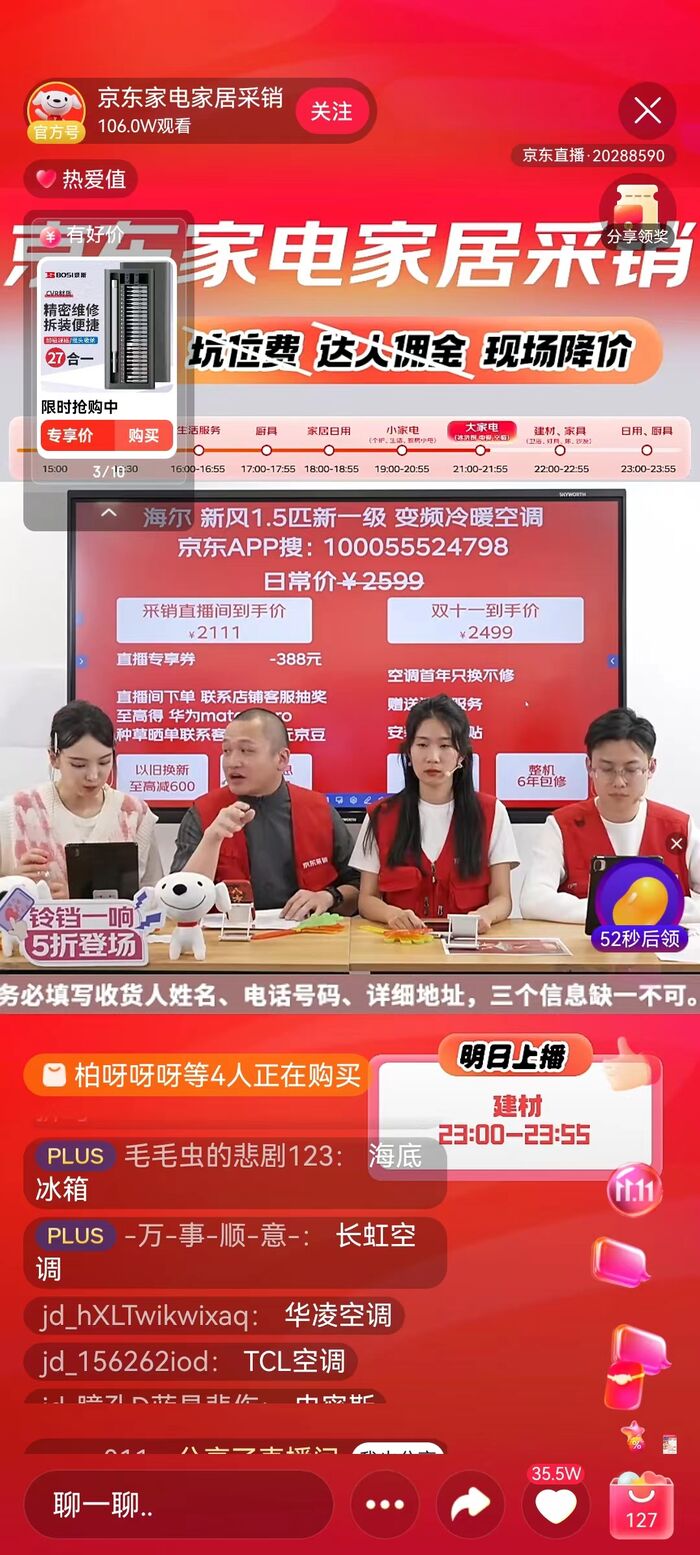 【亿邦原创】11月10日消息,今晚8点,京东双11已经进入高潮期。截至21时52分,京东家电家居采销直播间吸引106万人次观看,共上架127款商品。