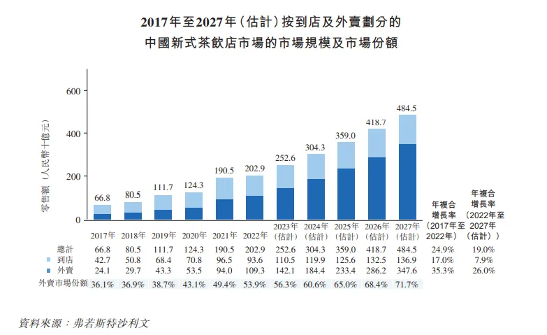 对大部分茶饮品牌而言,到店和外卖相当于业务的两只脚,缺一不可。弗若斯特沙利文提供的数据显示,茶饮行业外卖业务占据着越来越重要的地位。2022 年国内新茶饮市场超一半以上的市场份额由外卖形式完成。