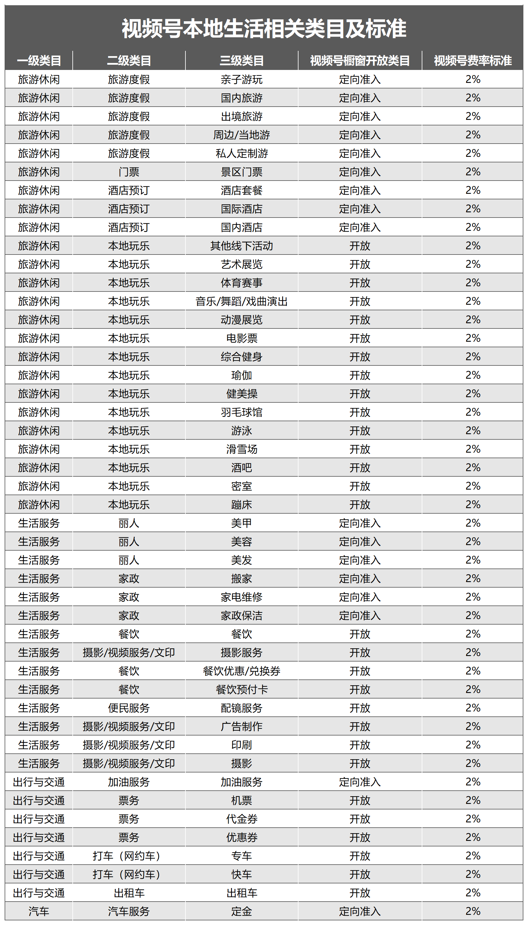 截至目前,腾讯视频号准入的本地生活相关三级类目共46个,其中定向准入的类目为17个,开放入驻则为29个;其中,美容、美甲、美发、搬家、家电维修、家政保洁、汽车定金等类目为定向开放,餐饮优惠/兑换券、餐饮预付卡为开放类目,餐饮团购仍在测试中。