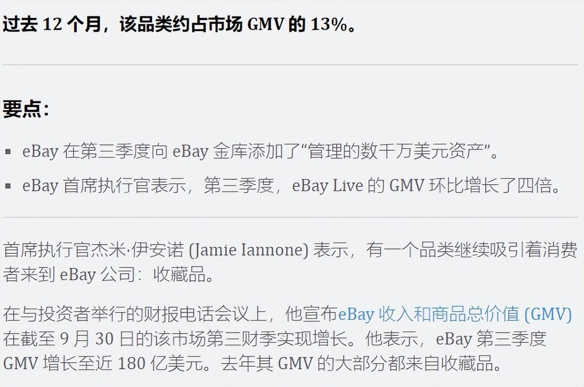 根据eBay发布的财报数据称,在第三季度,其GMV增长到近180亿美元,其中收藏品品类贡献了很大一部分。在过去12个月里,eBay GMV达到了约728亿美元,收藏品品类占比达到13%,创造了超100亿美元的GMV。