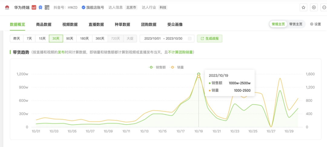 数据表现侧:华为发布的两支短片点赞量均超过41万,其中“如果感到幸福你就拍拍拍”话题在抖音站内的播放量超过5656万次。此外,根据飞瓜数据,10月19日华为终端直播销售额达到了1000万至2500万,为近30天最高。