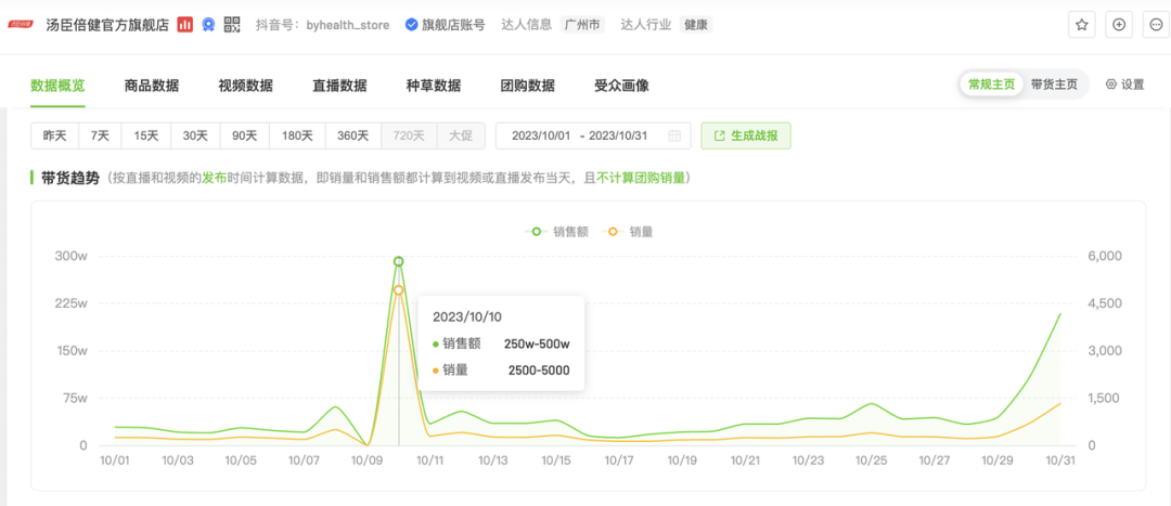 数据表现侧:汤臣倍健在抖音站内的主要传播话题“yep启冻美好”播放量超过4亿次。此外,根据飞瓜数据,10月10日汤臣倍健官方旗舰店直播销售额达到了250万至500万,为10月最高。