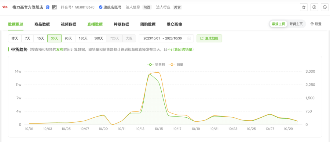 数据表现侧:格力高在微博的主要传播话题“Hello,me time!尽享我的时刻!”阅读量超过5925万。在抖音站内,品牌主要传播话题“就酱吧百力滋”获得了超过3666万次播放。根据飞瓜数据,格力高官方旗舰店近30天共开播29场,其中,10月14日当天的直播销售额最高。