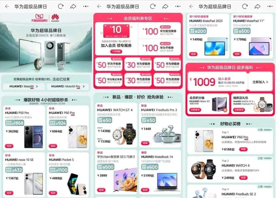 产品方面:华为超品日主推产品为新发售的HUAWEI Mate60以及Mate60 Pro。此外,HUAWEI P50 Pro、P60 Pro、折叠手机Pocket S、平板MatePad 2023、手表WATCH GT 4、蓝牙耳机FreeBuds Pro 3、笔记本电脑MateBook 14等全线电子产品均参与超品日活动。