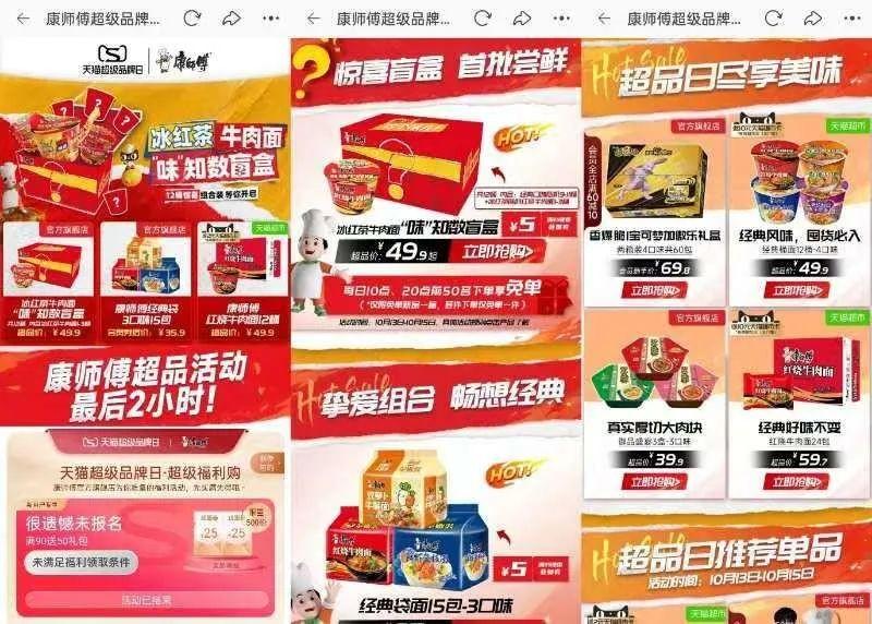 产品方面:品牌超品日主推产品为新上线的冰红茶味红烧牛肉面、以新品为核心组成的“内个味儿”全家桶、相关盲盒套装。此外,红烧牛肉面、双萝卜牛腩面、鲜虾鱼板面等经典袋套装,香爆脆加傲乐超梦礼盒、御品盛宴方便面等产品也参与了本次天猫超品日。