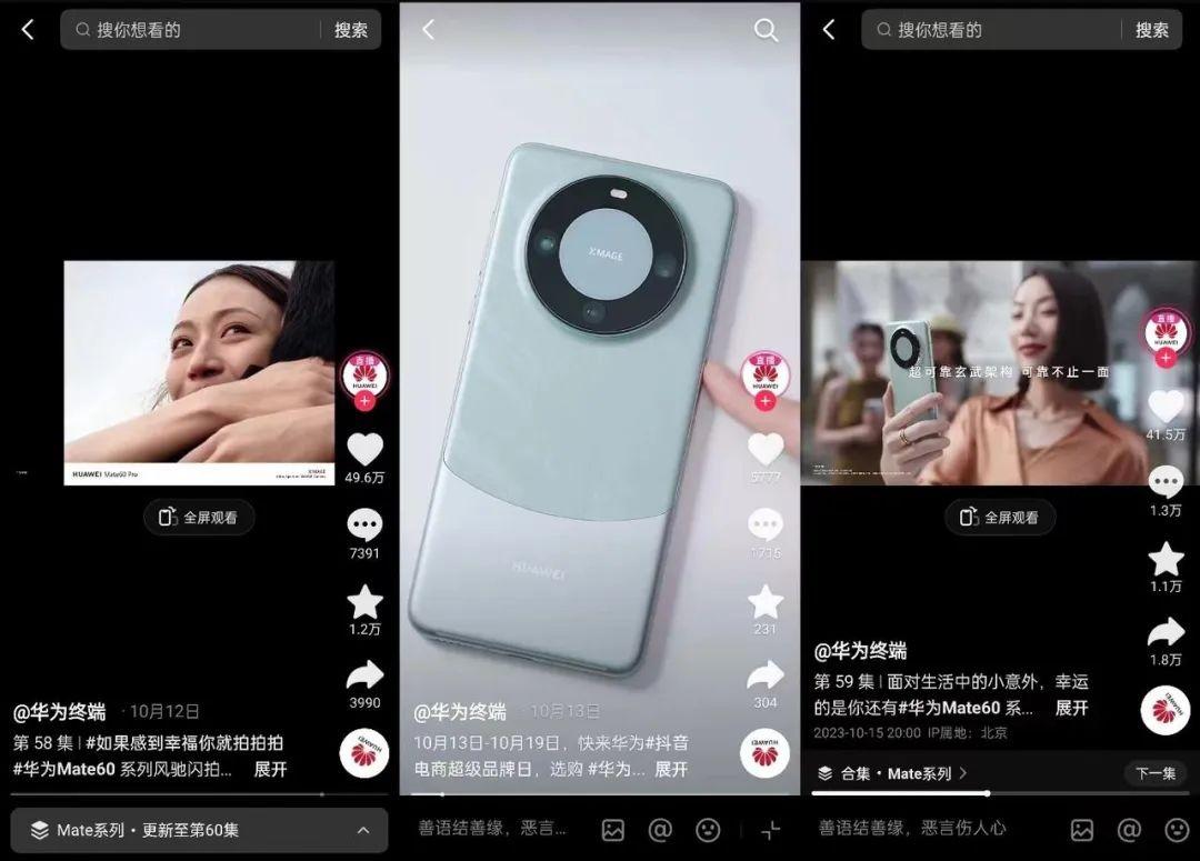 营销方面:华为为新品Mate 60打造了创意TVC广告“卫星通话 纵横山海”,通过呈现穿越沙漠、森林徒步、出海远钓、观星露营等种种户外场景,抓住没有信号的产品痛点,反复强调“打不通的电话,用卫星打”心智,宣传华为Mate 60系列手机的卫星通话功能。