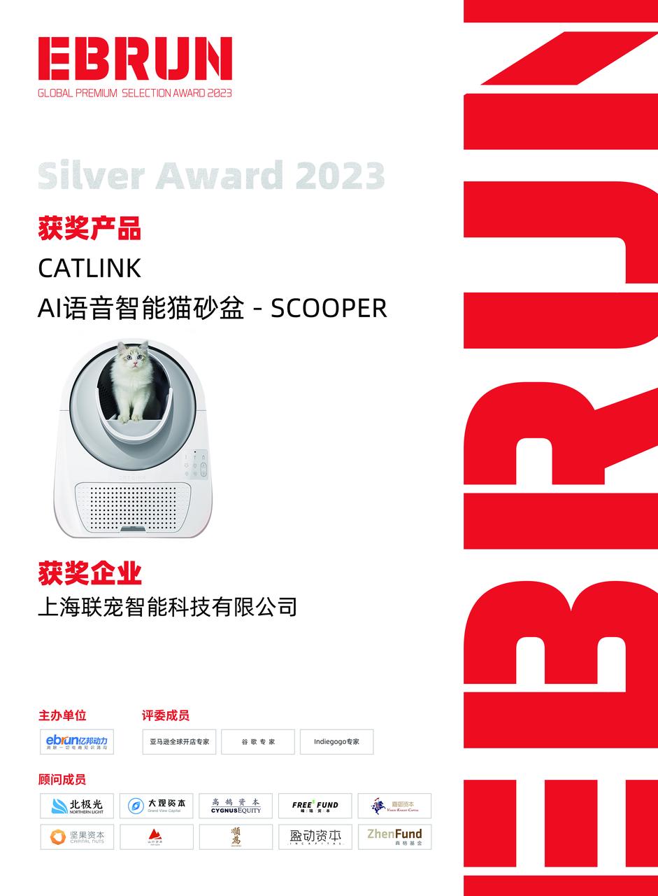 2023年11月30日,在亿邦动力举办的“EBRUN全球好物颁奖盛典”上,CATLINK的参选产品“CATLINK AI语音智能猫砂盆 -SCOOPER”获得了2023年度EBRUN全球好物Silver Award。