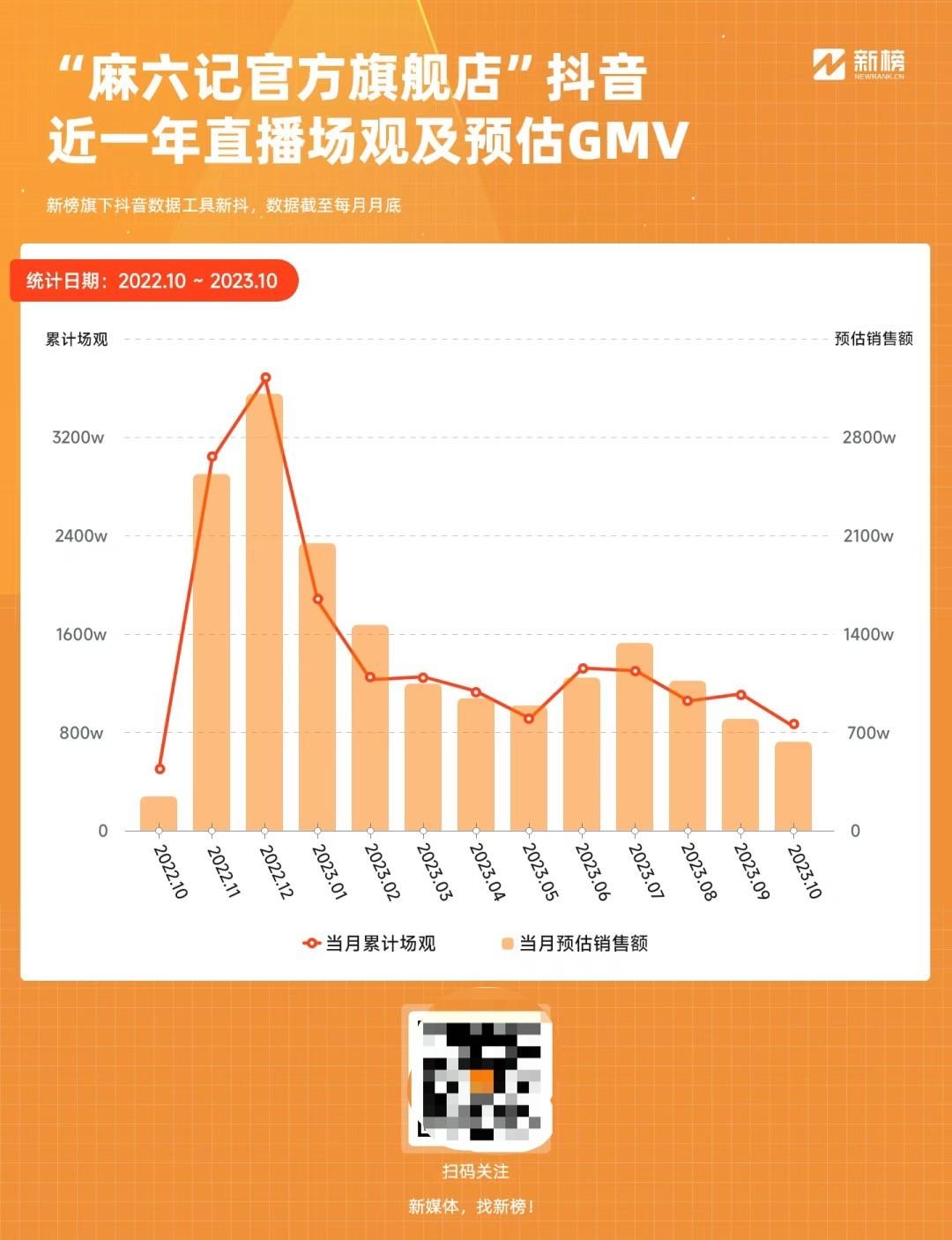 新抖数据显示,“麻六记官方旗舰店”的流量在去年12月达到顶峰,单月场观人次超3641万,预估带货销售额达3125万元。