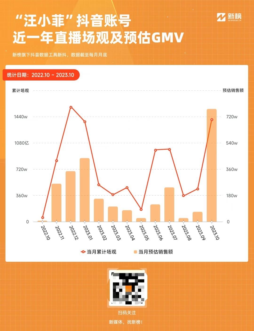 新抖数据显示,“汪小菲”近一年来平均每月开播12场,账号直播流量波动较大,近一年来,单月最高场观超过1617万,最低仅有163万。