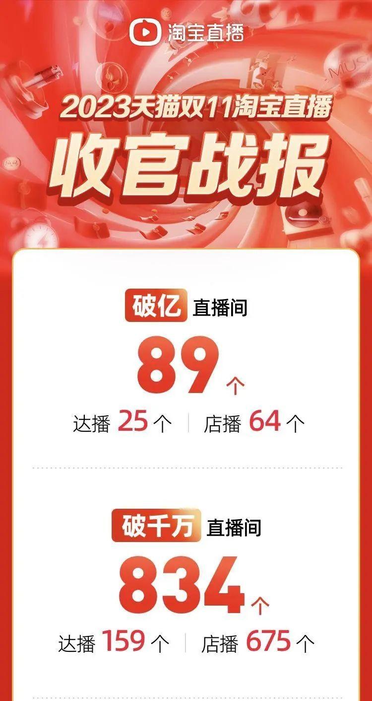 而截至11月11日24点,淘宝共产生89个破亿直播间。其中,有64个店铺直播间成交额破亿,675个成交额破千万。