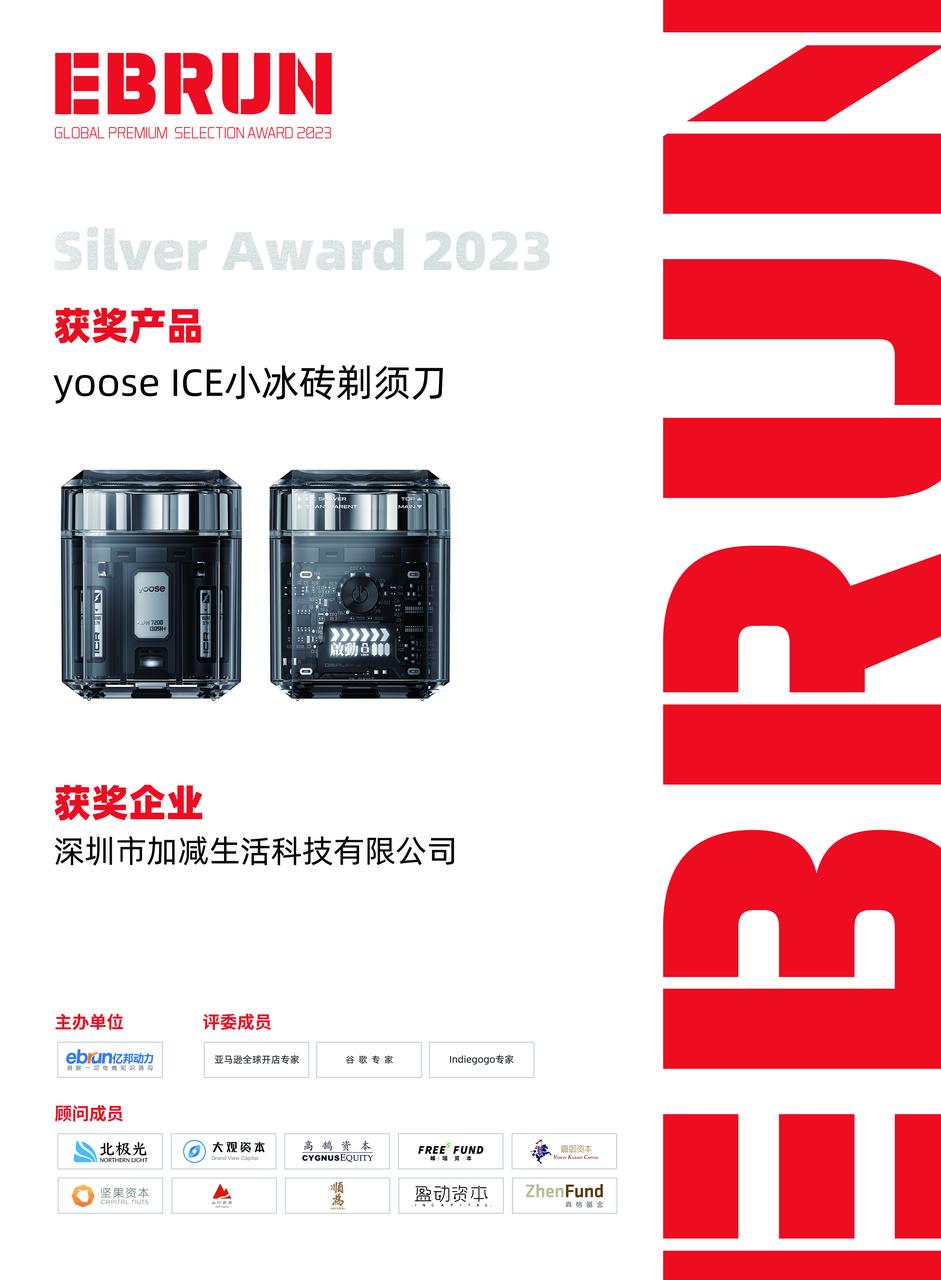2023年11月30日,在亿邦动力举办的“EBRUN全球好物颁奖盛典”上,yoose有色的参选产品“yoose ICE小冰砖剃须刀”获得了2023年度EBRUN全球好物Silver Award。