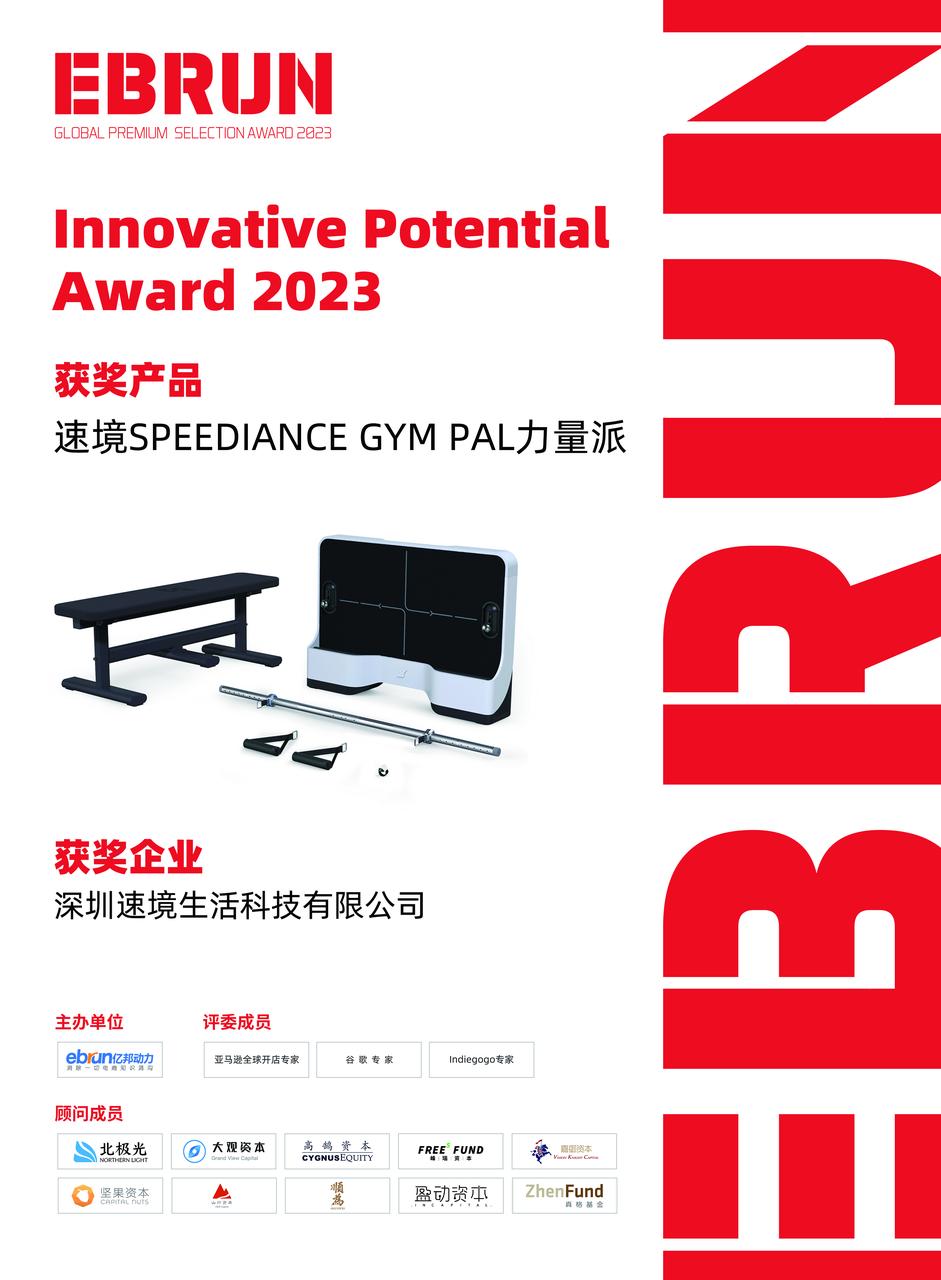 2023年11月30日,在亿邦动力举办的“EBRUN全球好物颁奖盛典”上,速境SPEEDIANCE的参选产品“GYM PAL力量派”获得了2023年度EBRUN全球好物Innovative Potential Award。