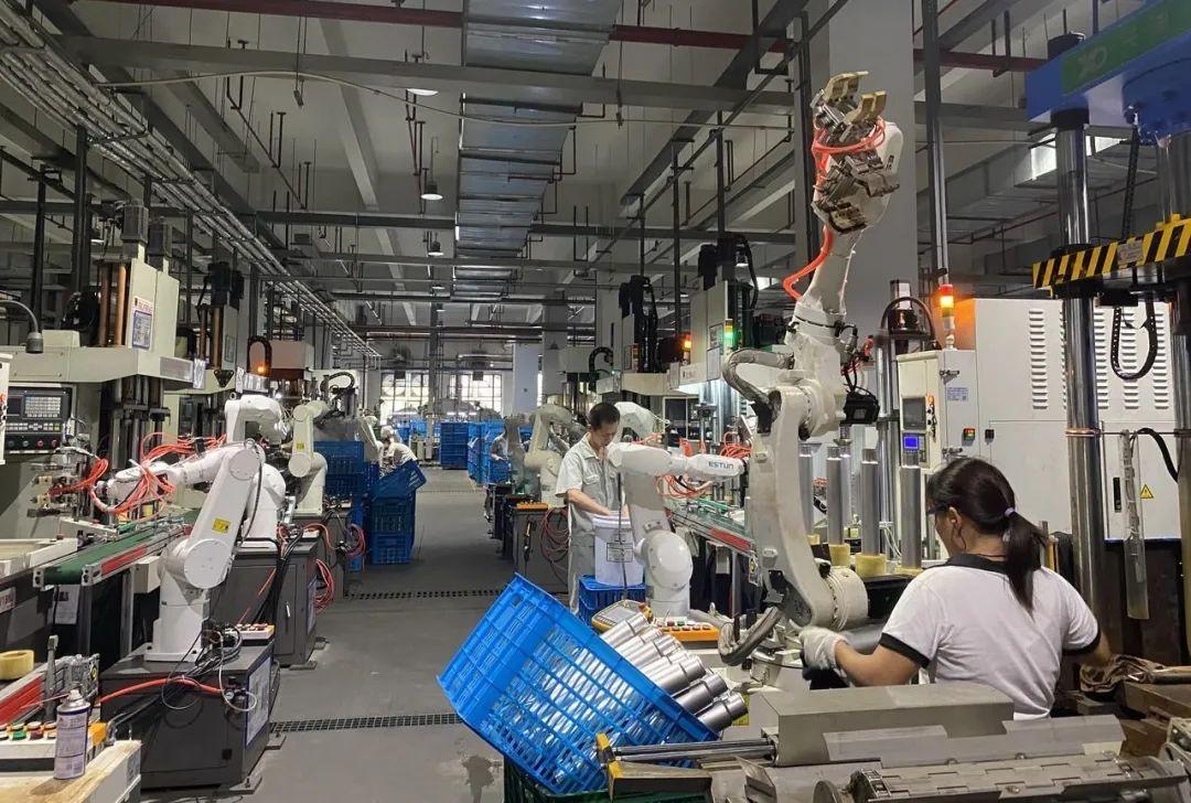 这是亿邦走访一家保温杯外贸工厂时的场面。硕大的机械臂与娇小的女工交相辉映,一曲后现代的赛博朋克重金属画风。