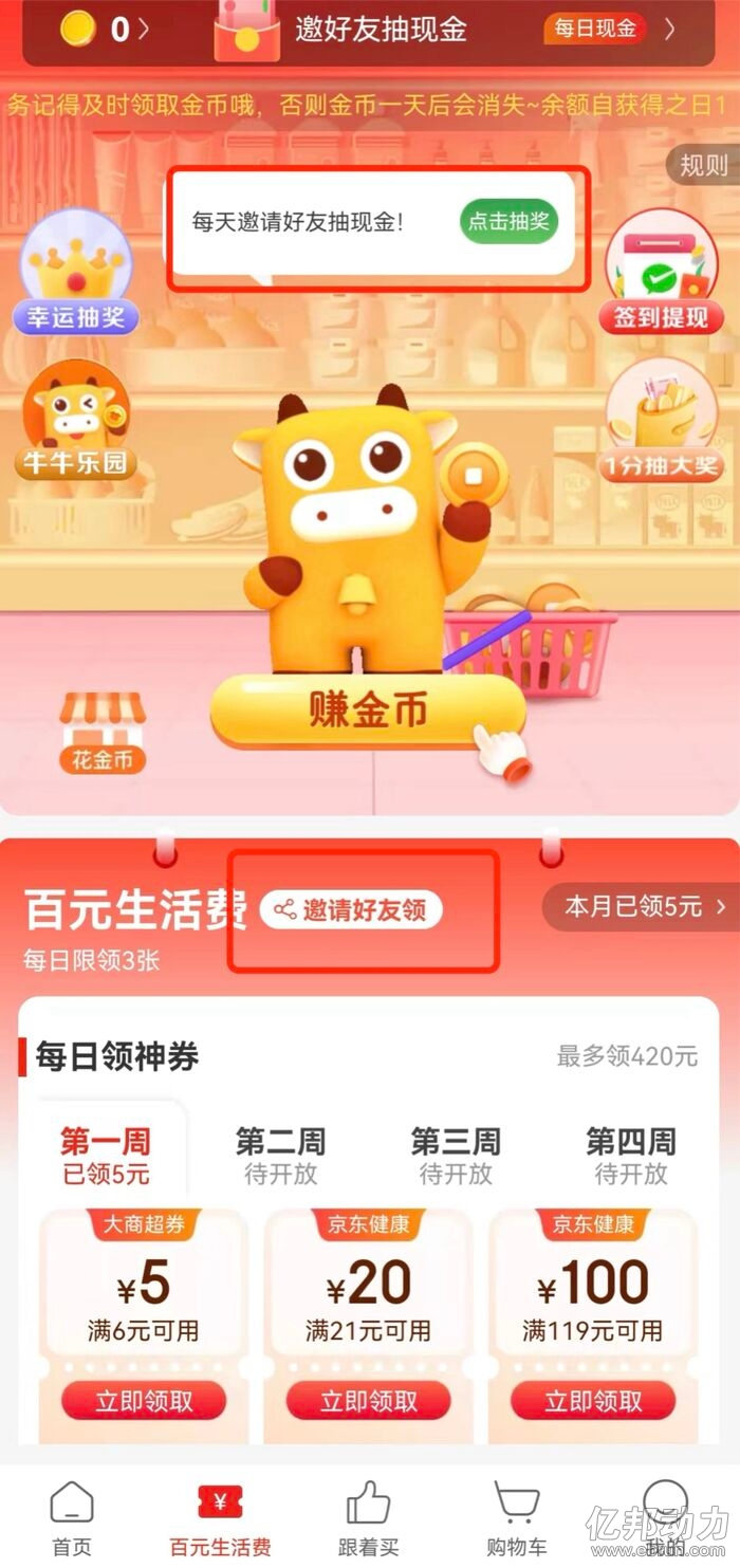 领金币活动中,用户可以通过邀请微信好友和QQ好友收取现金;也可以通过完成相应任务获得金币,进而将金币兑换成京东红包和商品优惠券。此外,百元生活费活动也设置了邀请好友领券的入口,支持分享至微信好友、QQ好友和微信朋友圈。