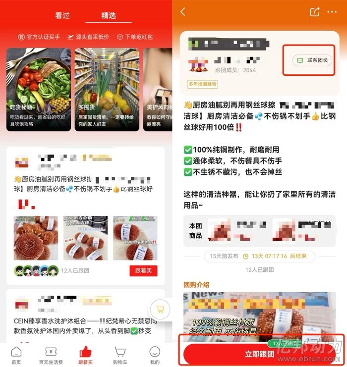 “跟着买”页面实际为图文内容集合页,同时帮助团长通过内容完成交易闭环。这一页面的图文大多为团长发布,图文详情页中设置了“联系团长”和“立即跟团”的入口。