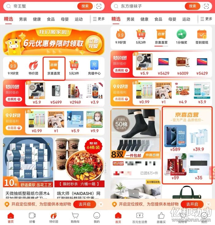 在京喜特价App内,亿邦动力发现首页为京喜直营频道提供了更大的面积。原本的京喜App首页,京喜直营频道只占据一个入口,与“9.9好货”“5元3件”等频道并列位于搜索栏下方。而升级后,在保留了原有频道入口的基础上,首页中间偏右的位置增加了专门的“京喜直营”频道卡片,强调兼具官方选品和低价的心智。