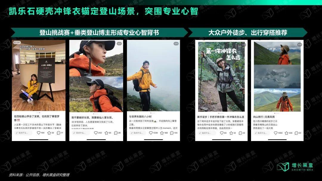 因此,凯乐石硬壳冲锋衣开始在小红书上借助专业领域的KOC来拓展户外人群新增量。首先,凯乐石锚定了最硬核的登山场景,通过发起线上挑战赛+线下户外活动实现专业心智背书,在登山场景打穿冲锋衣类目。随后,再向徒步、出行等大众户外场景进一步渗透。