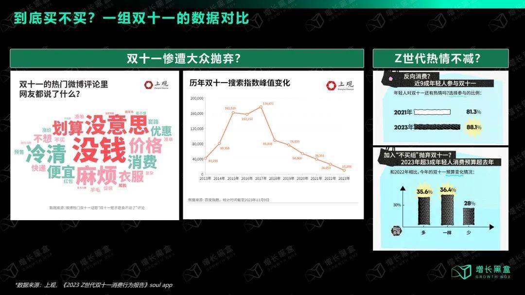 最近我们也发现了一个有意思的数据对比:从大众声音来看,他们对于双十一的热情急剧下滑,用户纷纷表示“没钱”、“没意思”。然而,从年轻人的视角来看,消费意愿没有受到太大影响。