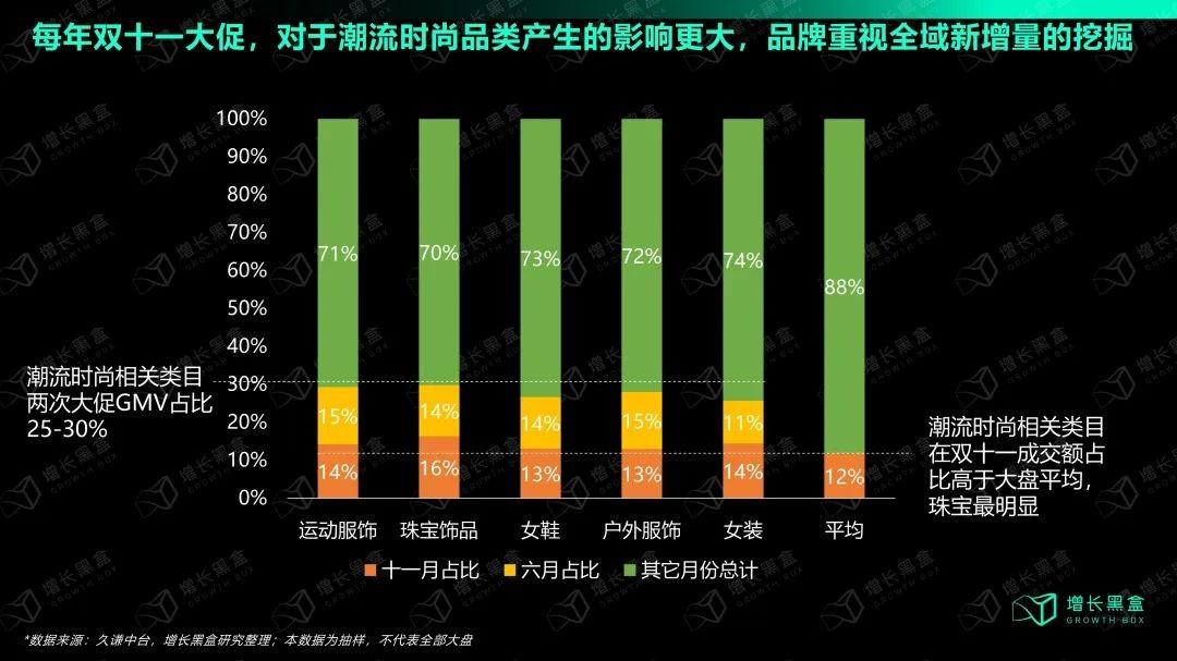 双十一对于潮流时尚品牌的重要性不言而喻。增长黑盒的研究显示,主流时尚品类每年交易额中平均有13-16%来自于双十一大促期间,高于大盘平均的12%,仅618和双十一两次大促,就能占据时尚品牌25-30%年度GMV。因此,潮流时尚品牌非常重视双十一期间对于全域新增量的挖掘。