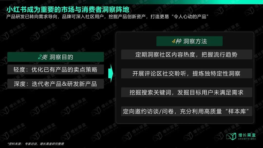 常规的产品洞察方法存在四个明显缺陷:成本高、样本量有限、周期长、信息维度窄。小红书上的高价值消费者,具备严格、有调性、爱分享使用体验等特性,有潜力成为企业VOC(voice of customers)的独特信息源,也是市场调研的独特样本库。