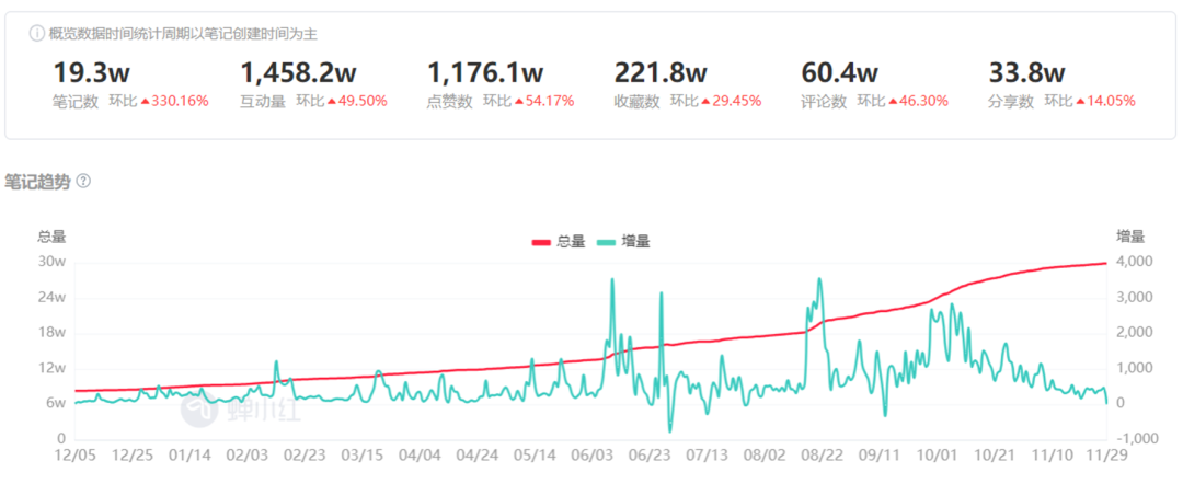 在过去一年时间里,冲锋衣成为小红书上最火爆的品类之一。根据蝉小红的数据,在冲锋衣类目下无论是相关内容数量,还是互动量,都呈现爆发式增长。