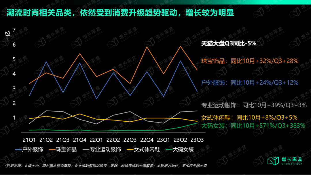 然而,当我们把数据进一步细拆,发现有些类目依然存在着“逆势增长”的亮点:以电商主阵地天猫来看,潮流时尚相关品类长期表现超过了大盘平均,不少品牌在今年都取得了理想成绩。另外,从抖音电商top20细分类目来看,翡翠珠宝、户外服装、套装等相关品类也有着较为明显的增长。
