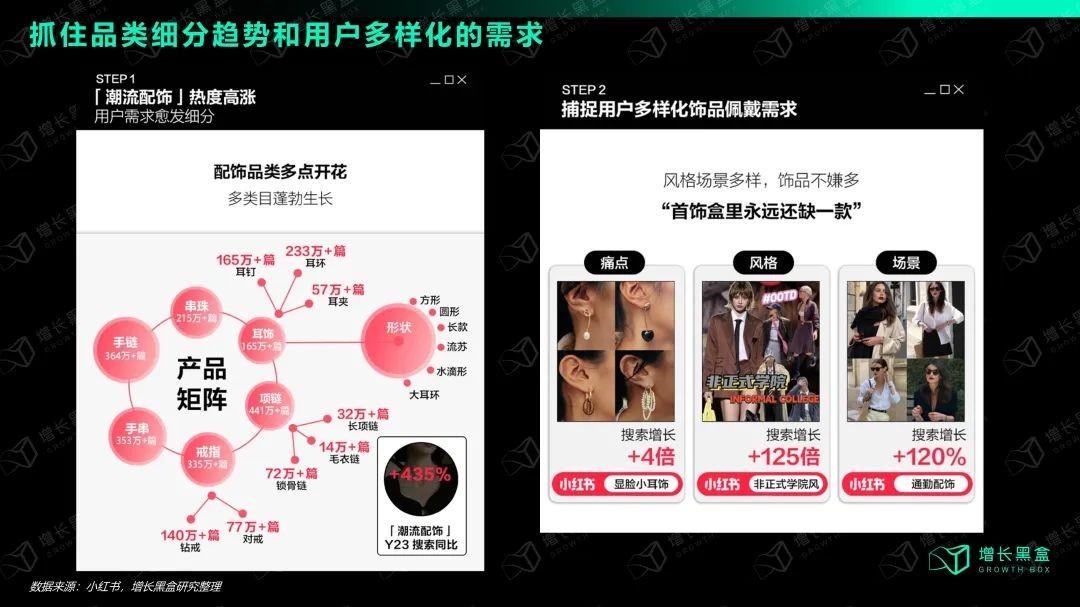 小红书的数据显示,2023年“潮流配饰”搜索同比增长4倍以上,这背后其实反映了众多细分品类的兴起。以耳饰为例,不仅可以分出百万篇耳钉、耳环、耳夹等笔记,还能进一步细分方形、圆形、水滴形等款式特征。相对应的,用户佩戴这些饰品的风格和场景也变得越来越丰富。所以,珠宝首饰品牌在小红书还有众多细分长尾的增量空间。