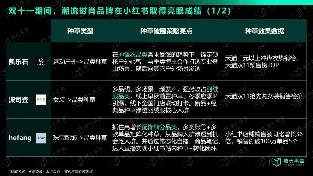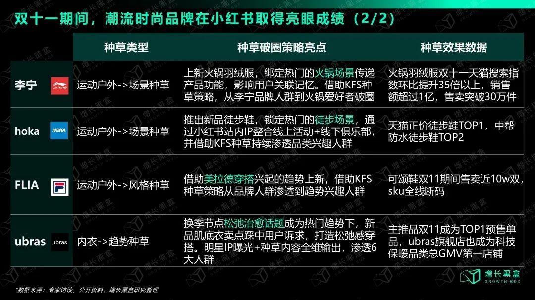 增长黑盒的研究显示,双十一期间潮流时尚行业已经在小红书做出了众多亮眼案例。比如较为成熟的品类、单品种草: