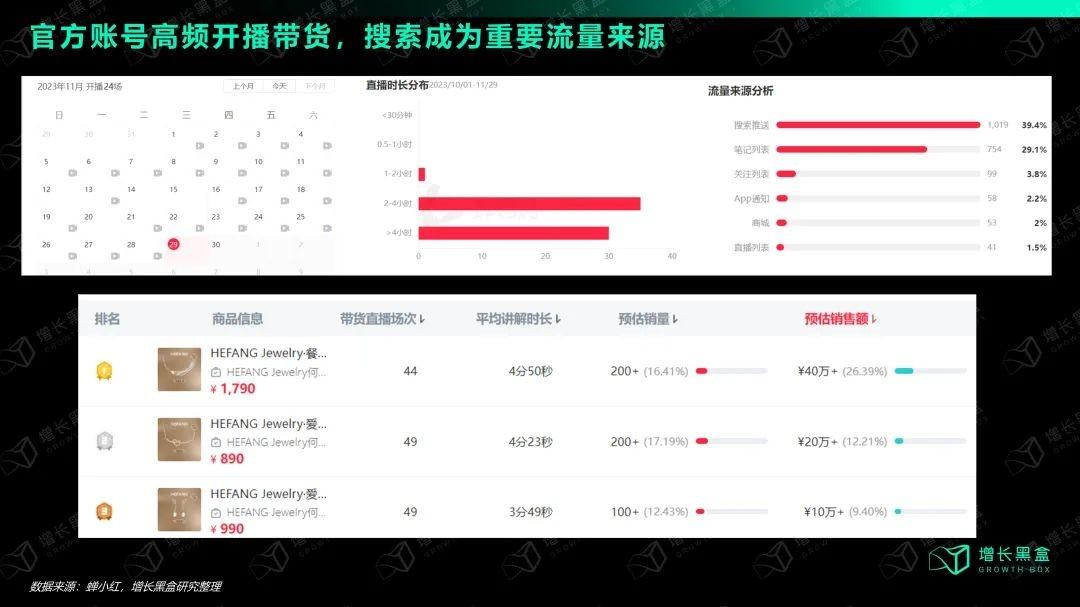 从站内自闭环来看,HEFANG依靠官方账号直播在小红书内部实现了种草转化一体。整个11月,官方账号开播24场,几乎每天都在直播2小时以上,且有众多单品的站内销售额超过了10万元。我们在分析过多场高GMV的直播后,发现搜索推送成为直播的重要流量来源- 这其实也对应了垂直品类、场景,与搜索更加匹配的现象,并且在货架电商时代就是如此。