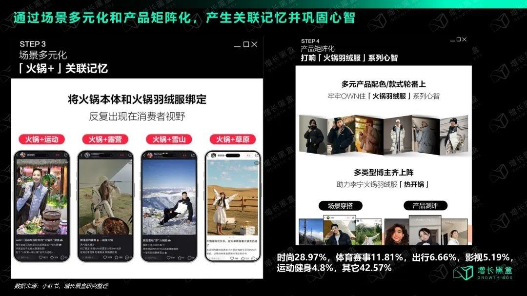 但想要把独特的卖点传递给消费者从而产生火锅场景关联记忆,只靠喊口号是没用的。因此,该新品做了场景多元化的设计。下图可以看到,“火锅场景”并不是坐在桌子边吃饭那么单调,而是由“火锅+露营场景”、“火锅+运动场景”等一系列多元化组合构成的。而我们利用OpenAI进行图像分析发现,这些博主种草的笔记中,无一例外会穿着新品羽绒服与火锅本体同时出镜。从而构成了“XX火锅场景作为背景+火锅本体+火锅羽绒服实体+人物”的视觉公式。