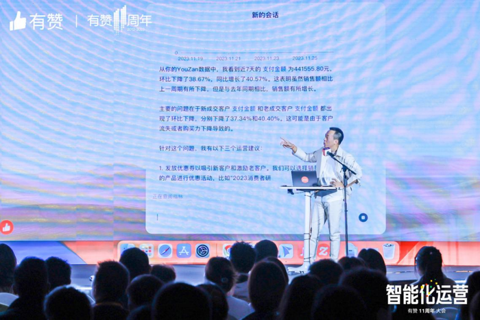 这就是为什么我说有赞会变成一个智能系统的运营商。我原来是软件公司,我接下来是运营商,我在运营智能系统,所以它就会增值。以前SaaS公司一半时间在向客户提供产品服务,一半时间在总结最佳实践和传递最佳实践。接下来AI总结和传递最佳实践的效率能提高100倍,软件研发的效率提高10倍,所以我们自己成本降低,效率提升,客户的效率就更高了。