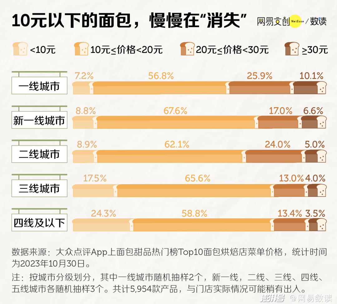 微博中一项针对34万人的投票调查显示,69%的网友对面包的价格预期在10元以内;仅有23%能接受10~20元的价格。[7]然而,根据网易数读对大众点评app上商家数据的分析,便宜的面包越来越少了。